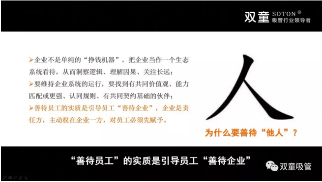 同時(shí),樓總也引導(dǎo)同學(xué)們透過(guò)現(xiàn)象看本質(zhì),“雙童”之所以15年前建設(shè)節(jié)能降耗系統(tǒng),消滅所有的污染排放是因?yàn)?/span>“雙童”看的很遠(yuǎn),用“利他”去獲得“利已”!