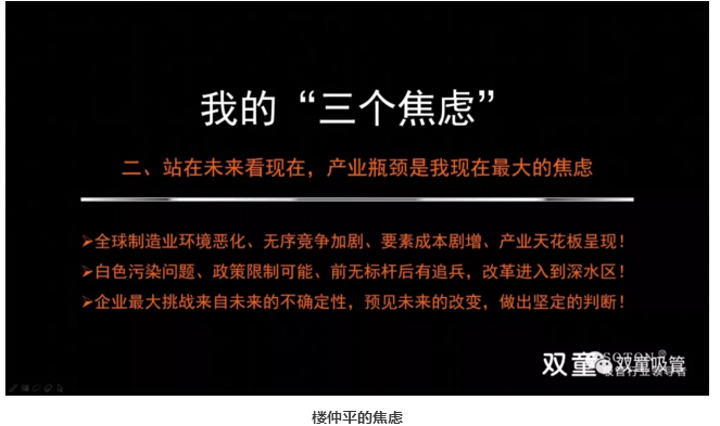 “同時,在這個高度變化的時代,企業(yè)最大挑戰(zhàn)來自未來的不確定性,制造業(yè)從1.0到4.0,‘雙童’離‘天花板’瓶頸也越來越近,這就是我們的焦慮。作為創(chuàng)業(yè)者來說,我要真正理解企業(yè)家精神,理解創(chuàng)業(yè)者需要思考的下一個維度,從而遇見未來的改變,做出堅定的判斷。”
