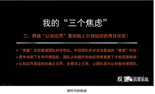 樓仲平分享了自己的第三個焦慮:2011年,“雙童”明確“再造經(jīng)理人”計劃,選拔培養(yǎng)年輕領(lǐng)導層,管理團隊更加年輕化,“雙童”管理團隊也更加年輕、有斗志,有激情。但當我看到這批年輕的管理團隊臉上洋溢著對未來的期待、渴求和夢想的時候,我明白他們現(xiàn)在正“嗷嗷待哺”,我需要給他們創(chuàng)造更大的空間和更廣闊的平臺,我產(chǎn)生了無限的壓力和焦慮。我要思考如何創(chuàng)造空間,讓他們實現(xiàn)更大的夢想,我不能讓我的邊界限制企業(yè)的未來十年,不能讓我的邊界限制年輕有為的管理團隊!