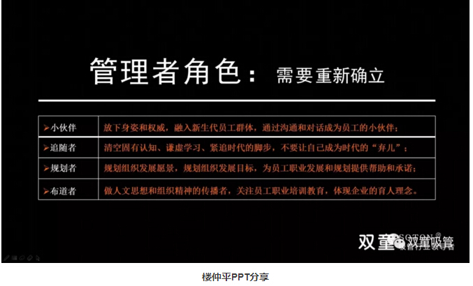 當(dāng)然在企業(yè)的年輕化的過程中,會(huì)有非常多的困難。第一個(gè)就是企業(yè)的管理者要改變心態(tài),要做員工的小伙伴,要走進(jìn)他們,了解他們;要做年輕人的追隨者,要追趕上年輕員工的腳步,不斷成長,讓自己的思想變成90后,00后。接下來,企業(yè)管理者要變成規(guī)劃者,要根據(jù)最新的潮流規(guī)劃企業(yè)的未來,3年,5年,如何讓企業(yè)駐立在潮頭。最最重要的是,企業(yè)家要成為這個(gè)企業(yè)的布道者,讓所有的員工都可以接受而且可以理解,并且共同努力完成企業(yè)的使命與價(jià)值。