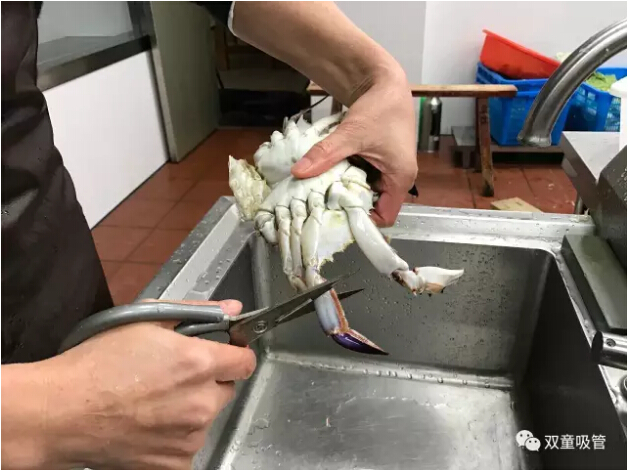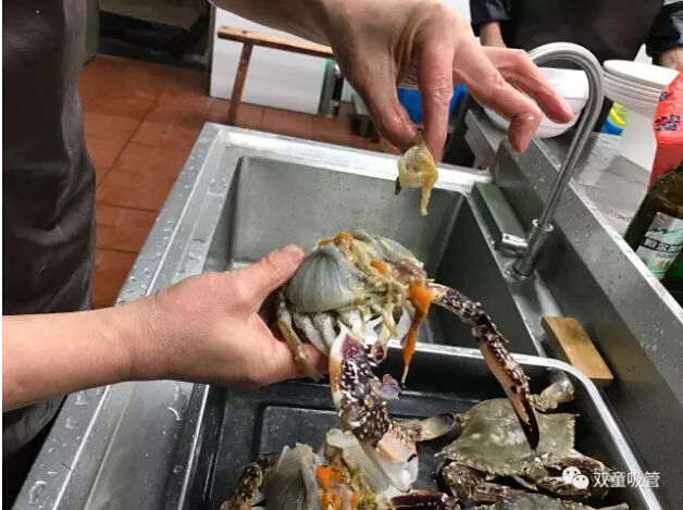十二、取出砂囊后將蟹身兩側(cè)的蟹鰓(看上去像魚(yú)鰓)用手工拔除干凈,如果蟹鰓底部有烏黑砂子,千萬(wàn)不要用清水沖洗,用干凈牙刷局部清洗一下就可以了。