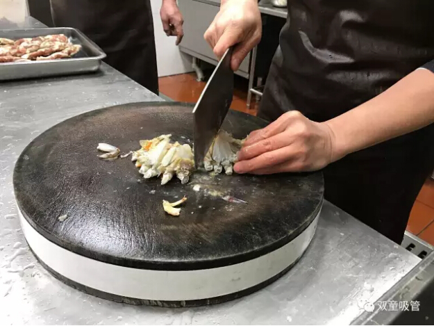 十四、再把蟹身切成幾塊。(大點(diǎn)螃蟹切分六塊、小一點(diǎn)螃蟹切分四塊)