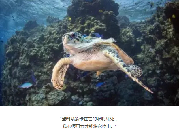 還有一位潛水大叔在海底發(fā)現(xiàn)被塑料卡住喉嚨的海龜。