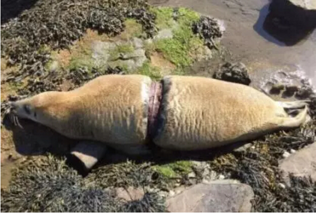 它被塑料打包環(huán)死死套住,自己沒(méi)辦法弄掉,越長(zhǎng)大就越緊,最終打包環(huán)卡進(jìn)它的肉里。