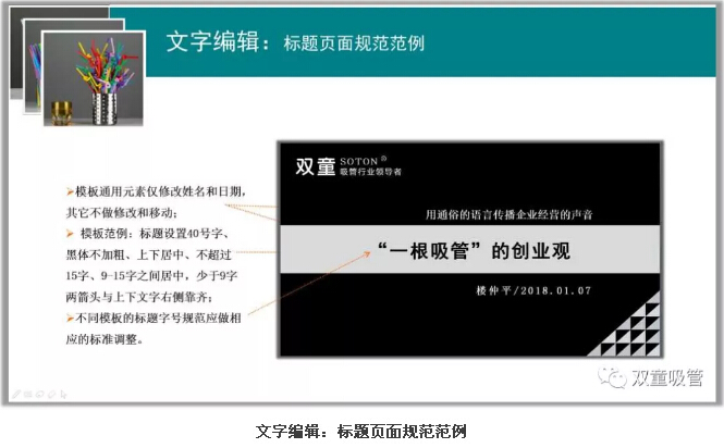 對PPT的空間進(jìn)行設(shè)置之后,文字編輯的標(biāo)準(zhǔn)規(guī)范也是制作PPT的重中之重!樓仲平和同學(xué)們詳細(xì)分享了模板文字設(shè)計標(biāo)準(zhǔn)規(guī)范、標(biāo)題的文字編輯規(guī)范,章節(jié)頁文字標(biāo)準(zhǔn)規(guī)范、正文的文字編輯規(guī)范、正文分段行間標(biāo)注規(guī)范等文字編輯的規(guī)范要求。