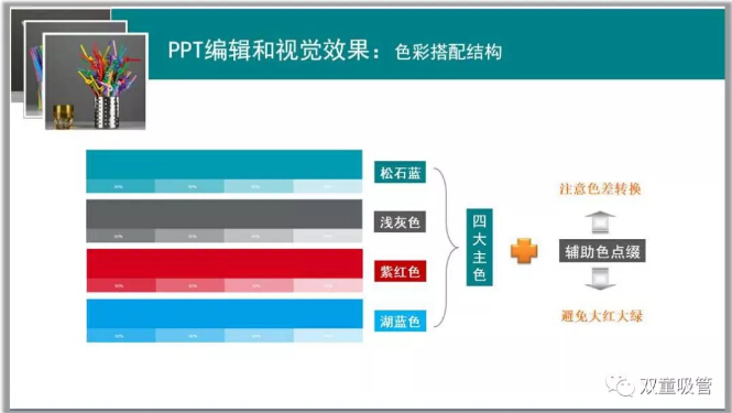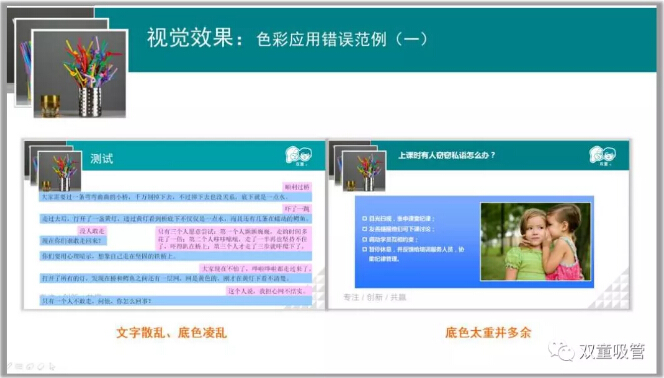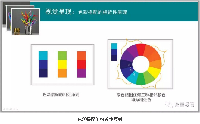 想要制作一個美觀的PPT,色彩的搭配也尤其重要!樓仲平也分享了色彩搭配的相近原則、色彩點(diǎn)綴的相對原則等技巧,下面就通過圖片來看看色彩的搭配和一些錯誤的案例吧!
