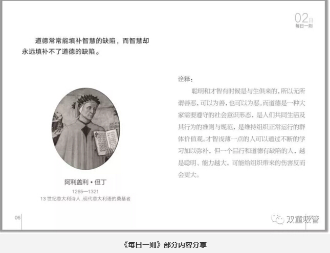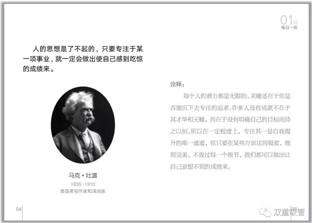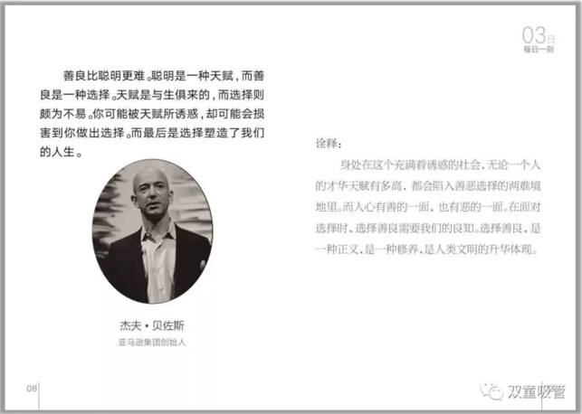 首先,就是晨讀環(huán)節(jié)。“雙童”所有員工在上班之前都會(huì)在統(tǒng)一時(shí)間誦讀“雙童”的企業(yè)文化叢書——《每日一則》。這本《每日一則》里,共收錄了31句名人經(jīng)典語錄,以月度為單位讓員工進(jìn)行重復(fù)誦讀,內(nèi)容包含了專注、創(chuàng)新、共贏、正氣等主題。這可是員工們從幾千條好句里挑出來,并且自己解析的呢!