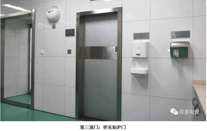 3.經(jīng)過(guò)了兩道防護(hù)門(mén)后,員工們更衣后通過(guò)更衣防護(hù)門(mén)進(jìn)入洗手消毒區(qū)域。
