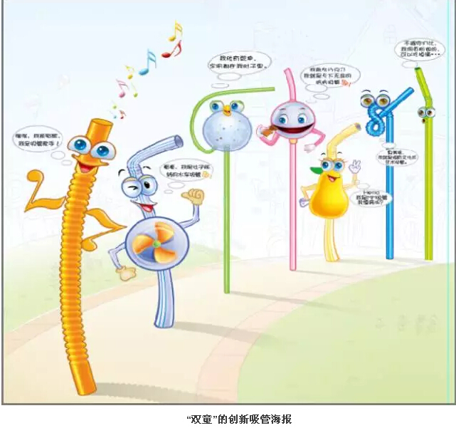 2006年,“雙童”開發(fā)的藝術(shù)吸管,原先是手工操作,“雙童”通過四年的努力研發(fā)機器設(shè)備,并開發(fā)出了全自動生產(chǎn)流水線,在2009年5月實現(xiàn)量產(chǎn),投入生產(chǎn)。截止到目前,“雙童”的藝術(shù)吸管占有了國內(nèi)市場的半邊江山,實現(xiàn)了“雙童”近1/4的產(chǎn)值。除此之外,“雙童”還研發(fā)了愛心吸管、眼鏡吸管等創(chuàng)新吸管,在市場上引發(fā)了極大的關(guān)注,塑造了品類多樣、敢于創(chuàng)新的企業(yè)品牌。至此,吸管不僅僅用來喝飲料了!