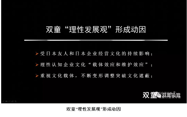 “雙童”之所以有“理性發(fā)展觀”,實際上是受日本企業(yè)經(jīng)營文化的持續(xù)影響,理性認(rèn)知企業(yè)文化“載體效應(yīng)和維護(hù)效應(yīng)”,重視文化載體,不斷變形調(diào)整突破文化遮蔽!