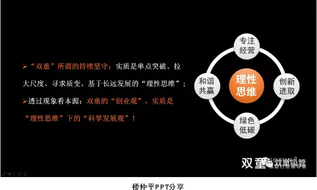 最后,樓仲平也對雙童“理性創(chuàng)業(yè)思維”進(jìn)行了總結(jié):它就是基于理性思考,忠于常識依據(jù),源于邏輯推斷,而非意識形態(tài)、信仰、情緒和喜好的“有別于他人”的商業(yè)思維和企業(yè)文化;而這樣的“商業(yè)思維和企業(yè)文化”必然是建立在“利他而利己”的前提之下,從而推動企業(yè)形成可持續(xù)發(fā)展的“科學(xué)發(fā)展觀”!