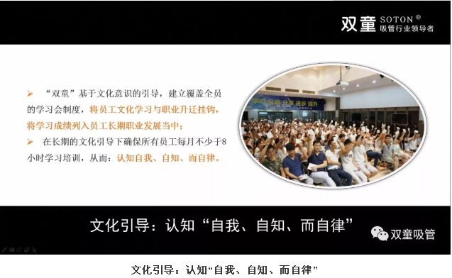 從企業(yè)經(jīng)營的角度來說,“雙童”就極為重視“文化載體”的維護(hù)和調(diào)整,建立了以“價值觀傳播”、“閃亮點傳播”、“自媒體傳播”的文化傳播體系。如:“雙童”基于文化意識的引導(dǎo),建立覆蓋全員的學(xué)習(xí)會制度。在長期的文化引導(dǎo)下確保所有員工每月不少于8小時學(xué)習(xí)培訓(xùn),從而引導(dǎo)員工們認(rèn)知自我、自知、而達(dá)到自律。