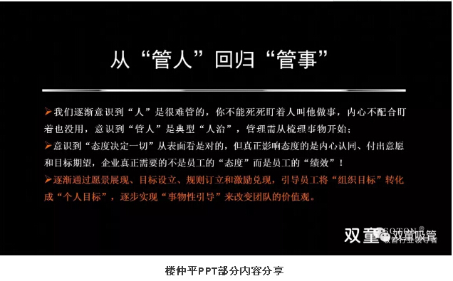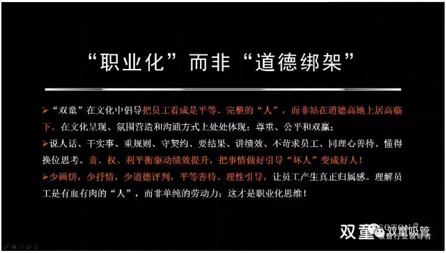 在“理性”思維的持續(xù)引導(dǎo)下,“雙童”在文化中倡導(dǎo)把員工看成是平等、完整的“人”,而非站在道德高地上居高臨下。在“雙童”的文化呈現(xiàn)、氛圍營造和溝通方式上,處處體現(xiàn)了“理性”思維,通過愿景展現(xiàn)、目標(biāo)設(shè)立、規(guī)則訂立和激勵兌現(xiàn),引導(dǎo)員工將“組織目標(biāo)”轉(zhuǎn)化成“個人目標(biāo)”,逐步實現(xiàn)“事物性引導(dǎo)”來改變團隊的價值觀。所以,管理不是管控、教條和賦予,而是激發(fā)和釋放每個人的善意,幫助員工成長、激發(fā)其創(chuàng)造,在共同追求中形成一致的價值和理念認(rèn)同。