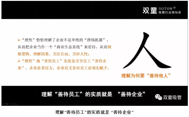 需要注意的是,所謂的“理性經(jīng)營”絕非是不講情理,更非冷血動物……“理性”關(guān)注的是“人性”所需,“雙童”建立以“人”和“家”為中心的人性化管理模式,“理性”地“善待員工”,實質(zhì)是引導(dǎo)員工“善待企業(yè)”。
