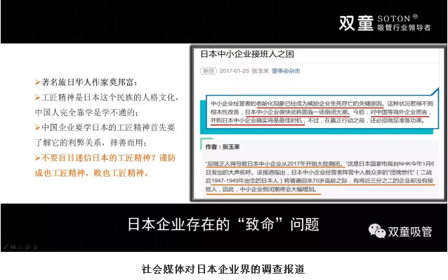 實際上,無論是從樓仲平二十多年來對日本社會的觀察,還是社會媒體對日本企業(yè)界的調(diào)查報道,都能發(fā)現(xiàn)日本在企業(yè)文化和就業(yè)認知上存在的巨大轉變。有亞洲中小企業(yè)研究第一人之稱的法政大學教授坂本光司先生一再提醒:過度專注堅持只做一個產(chǎn)品的企業(yè)會非常危險,至少要做3-5個產(chǎn)品。創(chuàng)新能力是目前日本中小企業(yè)的優(yōu)勢,但勢頭已開始衰竭!受互聯(lián)網(wǎng)發(fā)展影響,未來幾年日本大量百年企業(yè)將經(jīng)受前所未有沖擊! 現(xiàn)如今的日本中小企業(yè),正面臨著經(jīng)營者老齡化、二代傳承危機、創(chuàng)新力衰竭等一系列現(xiàn)實問題。