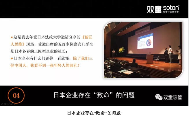首先,“雙童”樓仲平分享了日本奈良“一次性筷子工廠”的故事及日本企業(yè)存在的“致命”問題。如今,日本推崇極致“工匠精神”的企業(yè)被逐漸淘汰。另外,極致的“工匠精神”也讓日本年輕人不愿意接班,經(jīng)營層老齡化成為日本中小企業(yè)的突出特征!