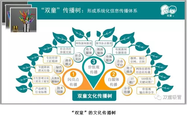 左邊是閃亮點(diǎn)的傳播介紹,包括了綠色制造、節(jié)能降耗、精細(xì)化管理以及技術(shù)創(chuàng)新等內(nèi)容。右邊通過微博、微信、博客、官網(wǎng)、百科等制造話題,即時(shí)發(fā)布博文、軟文、帖子等內(nèi)容,并進(jìn)行互聯(lián)網(wǎng)、IT推廣、展位推廣等自媒體的傳播。上邊則是政府、媒體關(guān)注的價(jià)值觀傳播。三大部分組成了“雙童”的文化傳播樹!