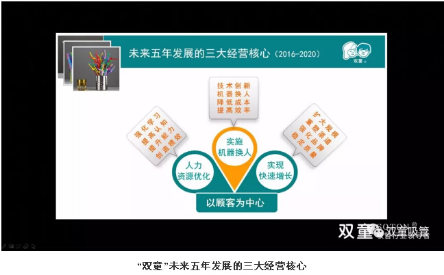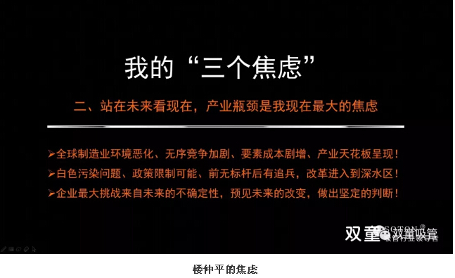 “同時(shí),在這個(gè)高度變化的時(shí)代,企業(yè)最大挑戰(zhàn)來自未來的不確定性,制造業(yè)從1.0到4.0,‘雙童’離‘天花板’瓶頸也越來越近,這就是我們的焦慮。作為創(chuàng)業(yè)者來說,我要真正理解企業(yè)家精神,理解創(chuàng)業(yè)者需要思考的下一個(gè)維度,從而遇見未來的改變,做出堅(jiān)定的判斷。”