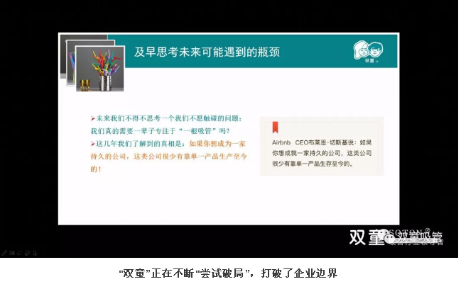 基于這樣的思考,“雙童”正在不斷“嘗試破局”。2016年9月,“雙童”發(fā)布了第四個(gè)《五年發(fā)展規(guī)劃》,但僅僅半年時(shí)間,我們對(duì)未來戰(zhàn)略進(jìn)行調(diào)整,對(duì)《五年發(fā)展規(guī)劃》進(jìn)行重新修訂,乃至于將《經(jīng)營哲學(xué)》中“五十年專注一根吸管”的理念刪除,去買土地建廠房為年輕人創(chuàng)造一個(gè)新的創(chuàng)業(yè)平臺(tái),以打破企業(yè)的邊界!