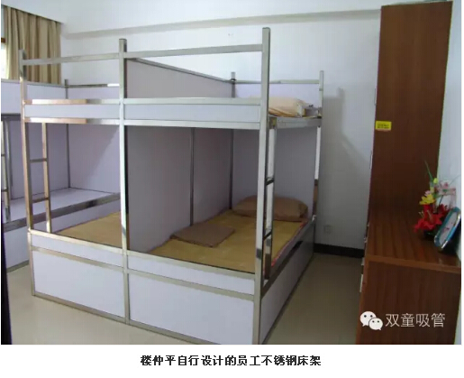“雙童”員工集體寢室的不銹鋼床架可是參觀團隊最津津樂道的話題之一!這些床架都是由“雙童”樓仲平自行設計,在建造之初就把床架焊在地上。這樣一來,即避免產(chǎn)生垃圾死角,床下又多了一個封閉的儲物空間,確保員工在生活方面的便利舒適!