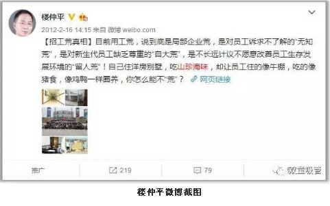 其實,“雙童”樓仲平由于早年坎坷辛苦的創(chuàng)業(yè)經(jīng)歷,一直對農(nóng)民工感同身受,十分注重員工的吃住問題。早在2012年,樓仲平就發(fā)布了一條關于員工住宿的微博,引起了極大的關注。微博上寫道:自己住洋房別墅,卻讓員工住的像牛棚狗窩,你怎么能留得住員工?員工是企業(yè)的基礎,對員工更好、企業(yè)反而會獲得更多!