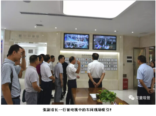 來到“雙童”吸管產(chǎn)品陳列廳時(shí),張副省長一行被墻面上的兩臺(tái)大屏三星液晶電視吸引。原來,這兩臺(tái)電視機(jī)上連接著車間的監(jiān)控端,讓客戶在不進(jìn)入車間的前提下也能了解到“雙童”的車間生產(chǎn)狀況!對于這樣的“神”操作,張副省長也給了個(gè)大大的贊!