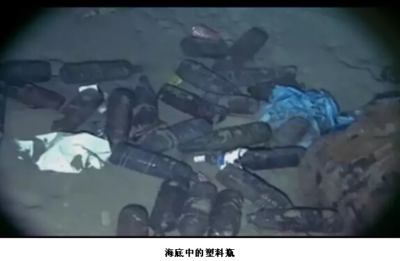 在深度計(jì)數(shù)器顯示海底1600米的地方,發(fā)現(xiàn)海底居然也是有著許多塑料瓶。