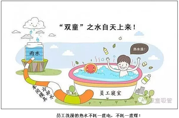 通過(guò)“雨水收集系統(tǒng)”,“雙童”每年可收集到5至6萬(wàn)噸雨水;通過(guò)“廢水處理收集循環(huán)系統(tǒng)”,企業(yè)每年可節(jié)省水費(fèi)支出40余萬(wàn)元;通過(guò)“設(shè)備余熱水采集利用循環(huán)系統(tǒng)”,可以實(shí)現(xiàn)員工洗澡的熱水不耗一度電、不燒一斤煤,全部使用雨水在設(shè)備上形成的余熱水。