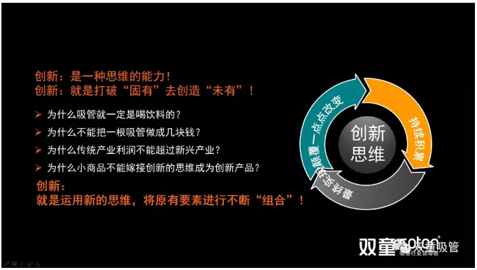 在傳統(tǒng)的認(rèn)知當(dāng)中,類似于吸管這樣的產(chǎn)品是典型的“低、小、散、弱”傳統(tǒng)邊緣產(chǎn)品。但“雙童”用創(chuàng)新的思維不斷努力,將一根小吸管做出各種花樣,顛覆了吸管就是喝飲料的傳統(tǒng)認(rèn)知!樓仲平也引導(dǎo)經(jīng)營(yíng)戶們創(chuàng)業(yè)就是打破“固有”創(chuàng)造“未有”,用創(chuàng)新的思維去做產(chǎn)品、做事業(yè),用科學(xué)的發(fā)展觀去思考,一定能改變自己乃至于整個(gè)企業(yè)的命運(yùn)!