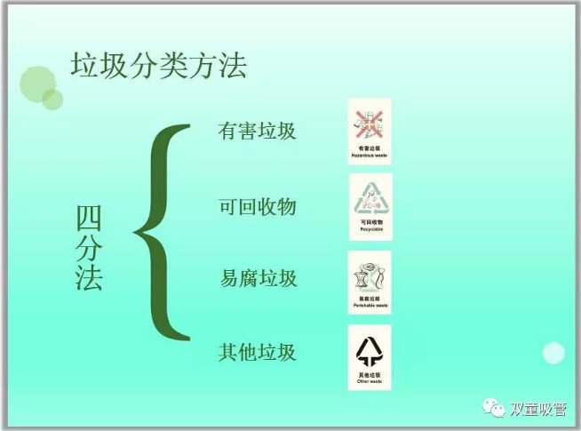 垃圾分類的方法:四分法分為有害垃圾、可回收垃圾、易腐垃圾和其他垃圾。
