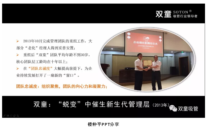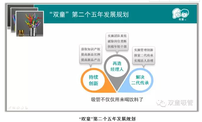 現(xiàn)在,公司有二三十個中高層,平均工齡10年以上,年齡30歲左右,都是我一個個帶出來的,“雙童”做的吸管是一個比較偏門的行業(yè),沒有行業(yè)的通用性人才,所以我們基本不用空降兵。這批人是我?guī)С鰜淼模蜕钍芪业挠绊?,在乎工作、可以放下身段,整體素質(zhì)遠超第一代管理者。這批第二代管理者培養(yǎng)起來后,至少打開了“雙童”未來二十多年企業(yè)持續(xù)發(fā)展的窗口。