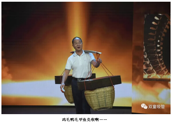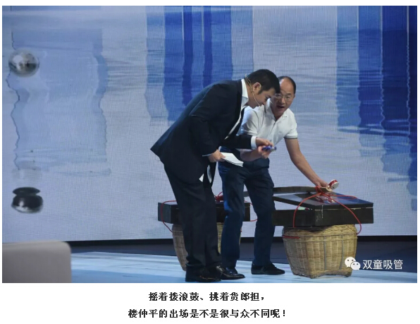 相比于其他兩位嘉賓,“雙童”樓仲平的出場方式可算是最“與眾不同”啦!看,當(dāng)主持人“鷗哥”邀請樓仲平出場時,他竟然搖著撥浪鼓、挑著貨郎擔(dān),口里還喊著“雞毛鴨毛甲魚殼收啊……”就上場了!