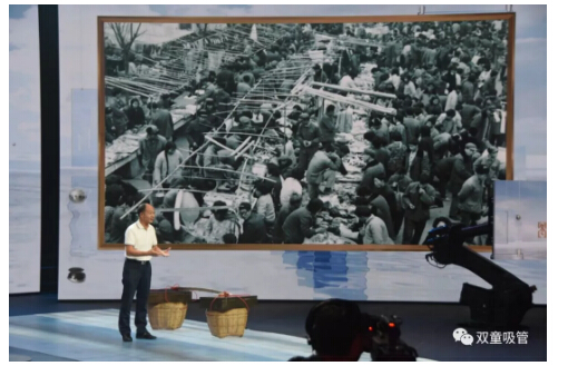 在節(jié)目現(xiàn)場,“雙童”樓仲平也帶來了許多精彩的照片。其中,開場照片便是義烏這座城市的對比照片。通過挑貨郎與義烏小商品城開展全球電商的照片對比,樓仲平講述了義烏如何從貧瘠落后的小縣城發(fā)展為全球最大的小商品集散中心的故事……