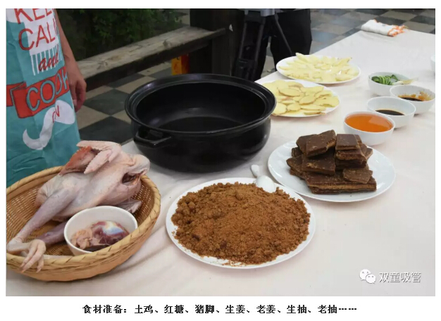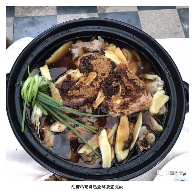 這道菜做起來可不簡單哦!除了有雞、紅糖、豬腳等主料外,還需加入七種調(diào)料,經(jīng)過12道工序后,用土鍋柴火燒制,并用稻草灰蓋鍋密封才能烹飪出更好的味道。 經(jīng)過大半天的燒制,“義烏紅糖雞”大功告成,色香味俱全?。≒S:嫩雞至少要燉1個(gè)小時(shí),老母雞至少要燉2—3個(gè)小時(shí))