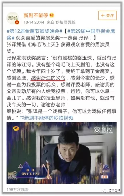 喜報(bào)!在昨天晚上的第29屆中國電視金鷹獎頒獎晚會上,講述義烏人創(chuàng)業(yè)故事的電視劇《雞毛飛上天》成為了最大贏家,一舉斬獲了“觀眾喜愛的男演員獎”、“優(yōu)秀電視劇獎”和“最佳編劇獎”!在男主角張譯上臺領(lǐng)獎時(shí),激動地稱:“感謝浙江的義烏!”