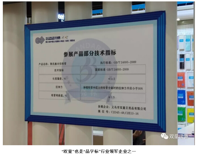 義博會現(xiàn)場,20余家“品字標(biāo)”行業(yè)領(lǐng)軍企業(yè)集中亮相,“雙童”也是其中之一。“雙童”展區(qū)不僅展示了琳瑯滿目的吸管產(chǎn)品,而且在最耀眼的位置擺放了組委會頒發(fā)的亮標(biāo)牌及產(chǎn)品技術(shù)指標(biāo)牌,讓來往的客商們第一時間了解到“雙童”產(chǎn)品參數(shù)及品質(zhì)。