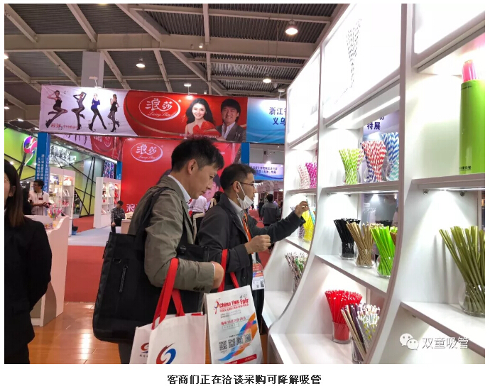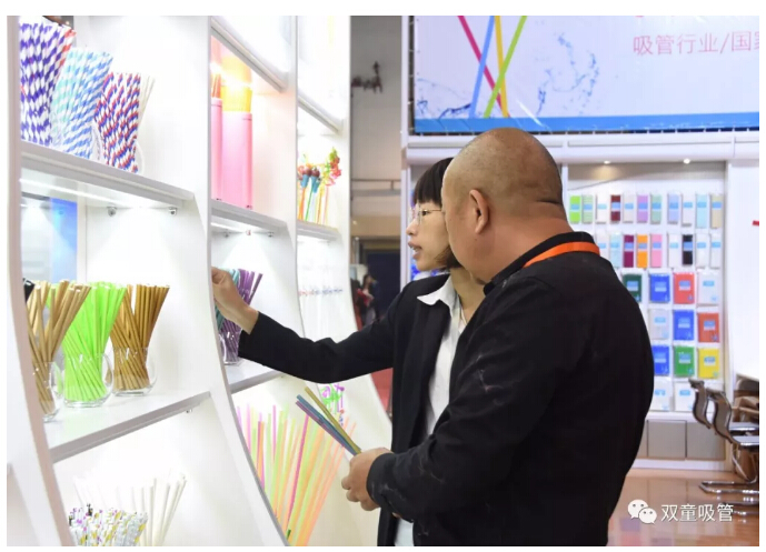 與以往不同的是,今年的“雙童”展區(qū)展示著眾多可降解吸管,他們成為了展會“明星”,吸引了大批新老客戶駐足采購。