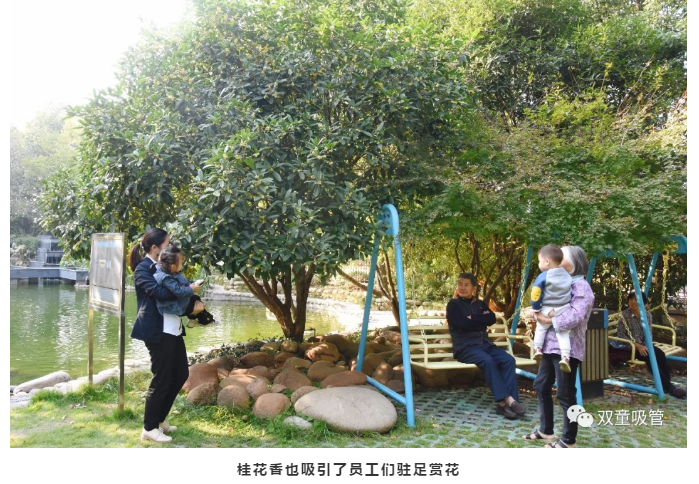 “雙童”人們?cè)诓栌囡埡罂倫劬墼诠鸹湎沦p賞綠葉、聞聞花香,置身陶醉于桂花的芳香之中,讓自己在緊張而繁忙的工作之余舒緩壓力,減少疲憊,給自己一種好心情!