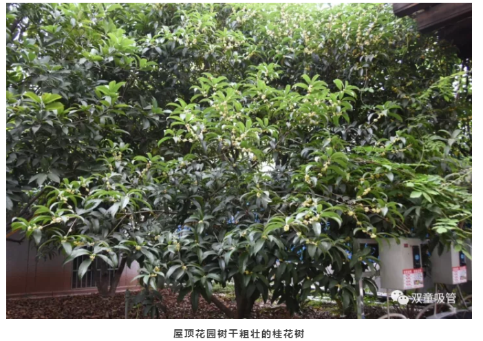 所謂“聞香不忘種桂人”,“雙童”樓仲平當(dāng)初在規(guī)劃廠區(qū)綠化時(shí),不僅在廠區(qū)地面種了數(shù)棵桂花樹外,還把桂花樹也種到了屋頂!“雙童”屋頂?shù)拿繅K種植區(qū)都有1米2深的土層,在建廠之初就考慮到了承重與防水的問題,所以可以放心栽種哦!
