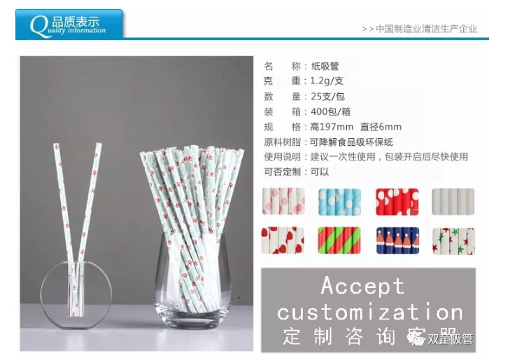 相對(duì)于塑料吸管,紙質(zhì)吸管以食品接觸類原紙為主要材料,并能用大豆基油墨印刷各類花色,在顏色鮮艷飽滿的同時(shí),確保安全無(wú)毒無(wú)異味,在回收廢棄后三到四個(gè)月內(nèi)可完全降解,符合歐美國(guó)家對(duì)食品安全包裝的衛(wèi)生要求,可用于生日派對(duì)、餐飲連鎖、家庭消費(fèi)、兒童DIY用具等各類場(chǎng)所!