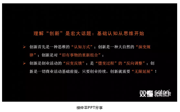 原來,正是因為不斷的學習提升,樓仲平自身的思維也發(fā)生了轉變。他的課程也從最初的創(chuàng)業(yè)經(jīng)歷分享轉變?yōu)橥高^經(jīng)驗層面的底層邏輯形成思維理念,從而引導創(chuàng)業(yè)者思維認知轉變!