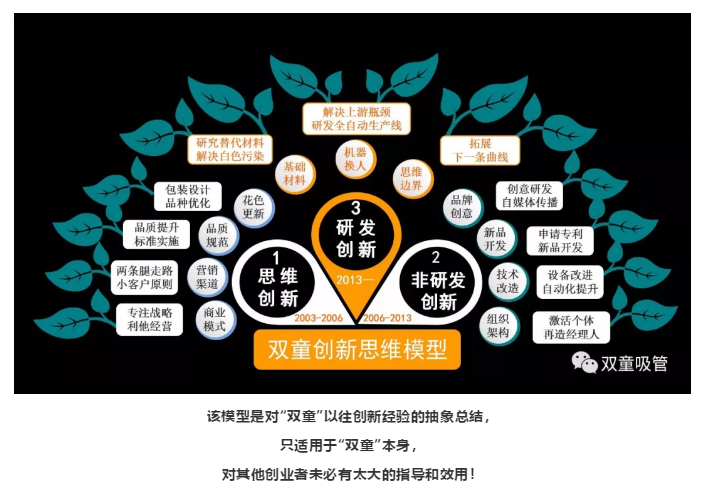 2003年開始,“雙童”提出了“兩條腿走路戰(zhàn)略”和“小客戶原則”,走差異化轉型路線,進行思維創(chuàng)新。同時,“雙童”通過技術改造、新品開發(fā)、品牌創(chuàng)意等開展非研發(fā)創(chuàng)新工作,通過打開思維邊界、機器換人、研發(fā)可降解產(chǎn)品等開展研發(fā)創(chuàng)新,從而促進和推動企業(yè)的發(fā)展!