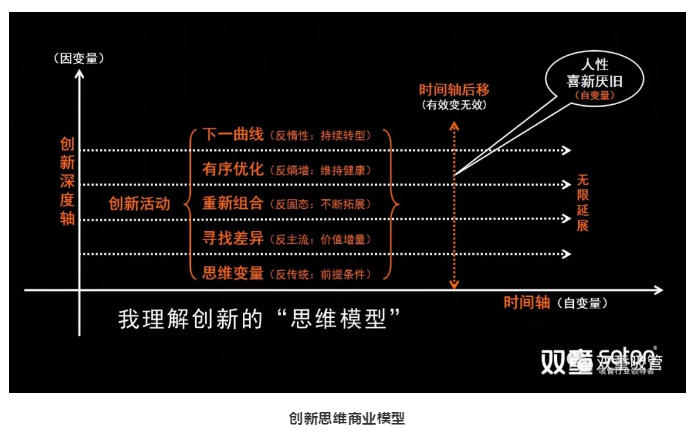 在“創(chuàng)新思維商業(yè)模型”中,X軸是時間軸,屬于自變量。Y軸是創(chuàng)新深度軸,屬于因變量。在這個模型里面,創(chuàng)新活動分為五個層次,越往上走,說明企業(yè)的創(chuàng)新深度越深;越往后走,說明隨著時間的增長,原來有效的創(chuàng)新活動變成無效,需要持續(xù)創(chuàng)新,無窮無盡……