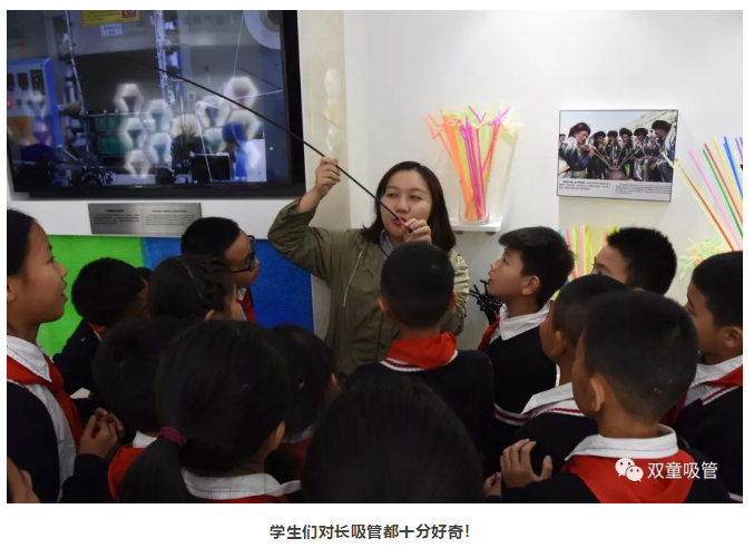 進入吸管博物館后,琳瑯滿目的吸管讓孩子們十分歡喜,大家?guī)е鴿M滿的好奇心緊跟吸管妹妹身后,深怕錯過了關(guān)于吸管的“秘密”!來到長吸管區(qū)域時,“超長吸管”更是讓孩子們驚奇不已:“原來還有這么長的吸管呀!”