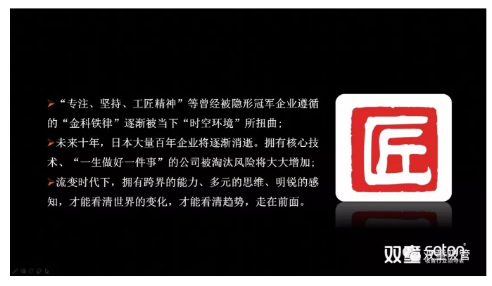 樓仲平分享道:“工匠精神”來源于日本,是一種骨子里的敬業(yè)和守業(yè)精神。它是日本民族中人格文化的體現(xiàn),完全靠學是學不會的?!肮そ尘瘛眰魅胫袊?,通過政府、社會的推動已經(jīng)成為一種口號、一項運動、一種共識。我們要意識到任何一項事物一旦被社會所號召,如果創(chuàng)業(yè)者沉迷其中,就沒有企業(yè)經(jīng)營中的差異化所在。