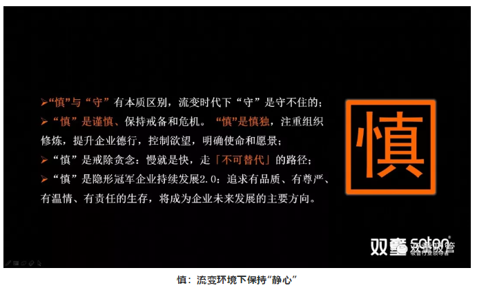 其實,“慎”跟“守”有本質(zhì)區(qū)別。流變時代下,“守”是守不住的?!吧鳌?,對企業(yè)來說是要認識到這個時代給我們帶來的巨變沖擊,并知道自己的不足和短板。所以,“慎”是保持謹慎、戒備和危機。