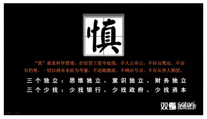 “慎”也是科學管理的本真,我們要有自己獨立的意識,要有自己獨立的思維,在經(jīng)營上要有自己的獨立判斷,堅守底線,不人云亦云,一切以商業(yè)本質(zhì)為考量,不追隨潮流、不響應號召、不盲從旁人期望?;谝陨希铱偨Y(jié)出“三個獨立”和“三個少找”: