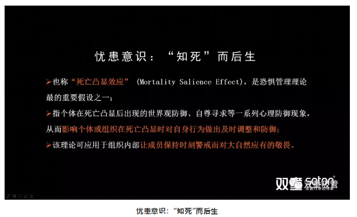 舉個例子。人類是所有動物當中唯一知道自己要死的動物,從而對自己的死有所準備、有所意識、有所恐懼,有所戒備,從而更早地讓我們有干預,讓我們?nèi)ビ虾透淖?。這樣一種“死亡凸顯效應”就叫“知死而后生”。