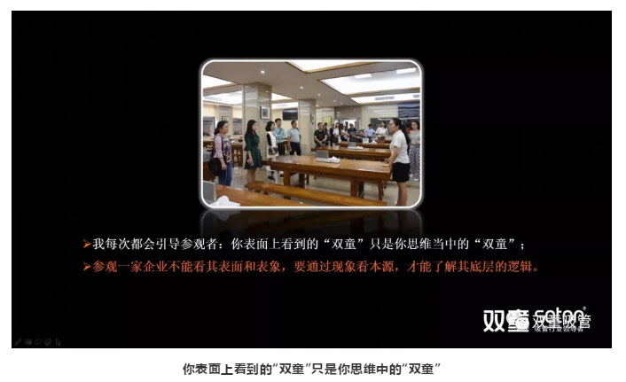 “但如果我有時間跟參觀團(tuán)隊交流,我都會引導(dǎo)大家認(rèn)知到,你所看到的只是表面的‘雙童’,大家要通過現(xiàn)象看本源,要了解‘雙童’為什么會這么做,企業(yè)這樣做的底層邏輯在哪里?一味照搬仿制是沒有意義的!”