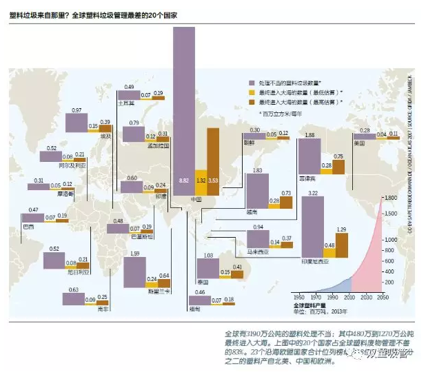 通過外河排入海洋的塑料垃圾數(shù)量為何如此驚人?最大的原因在于對塑料垃圾管理的失敗! 據(jù)《海洋地圖集2017》顯示,全球塑料垃圾管理最差的20個國家中,中國處理不當(dāng)?shù)乃芰侠鴶?shù)量大約為882百萬立方米/每年!